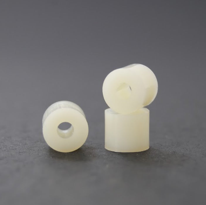 Tough and resilient, nylon spacers are useful for many applications, even outdoor ones! They are ideal for use in electrical and electronic assemblies. They also can be used as bushings, bearing, rollers, and glides. Molded from corrosion resistant Type 6/6 Nylon.
