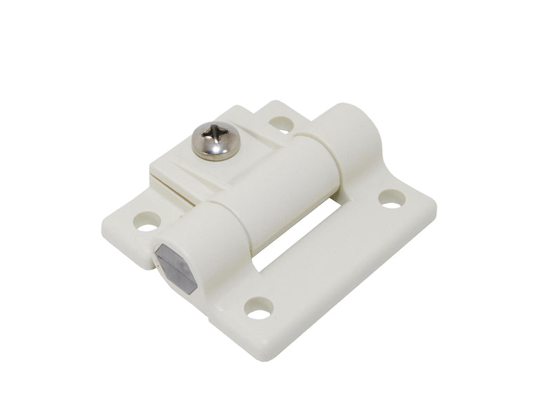 These plastic hinges are more than just plastic hinges. The adjustment screw on the top of the hinge adjusts the tension around the pin, allowing the hinge to either move freely, or only when needed. This hinge can be used to hold a door open, closed, or anything in between!