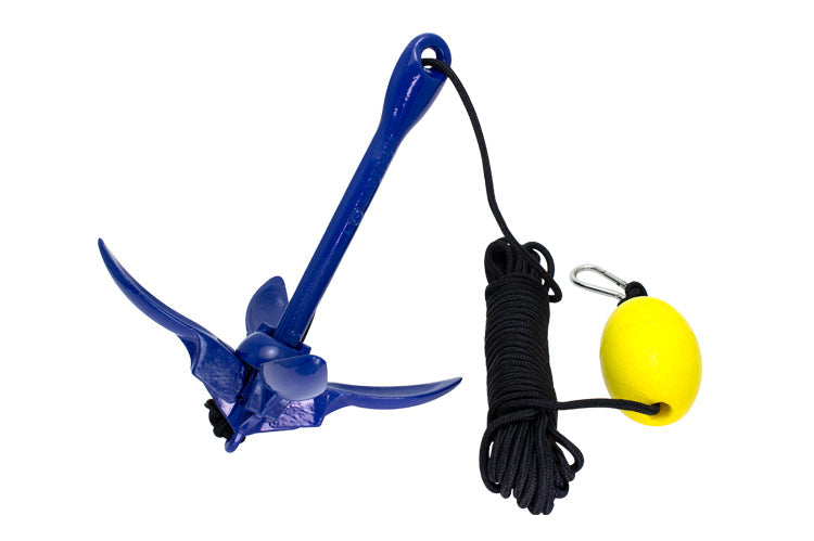 The Folding Grapnel Anchor is cast iron galvanized and will hold in mud, sand, gravel, and rock. It is designed for the temporary mooring of small boats, sailboats, personal watercrafts (PWC), inflatable boats, canoes, and float tubes. It comes complete with one galvanized shackle (G8001 series only), 38 feet of nylon rope spliced to it, an in-line buoy which slides up and down the rope, a stainless steel spring clip at the end and a nylon storage bag. The storage bag means you can neatly stow this anchor system in your PWC or boat, protecting it and your vessel. It fits into most personal watercraft seat compartments. The blue color option makes the anchor easy to spot in the water.
