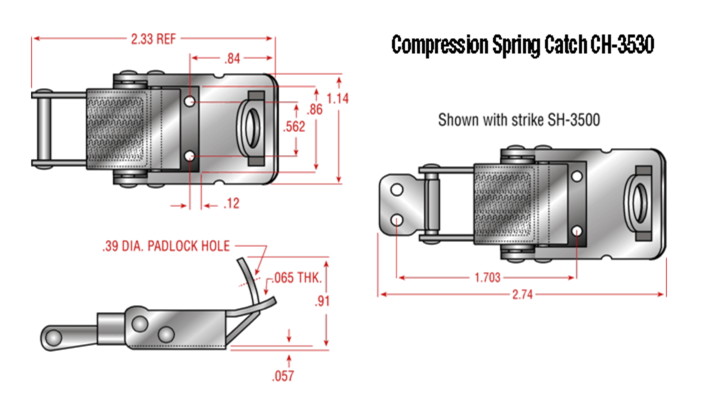 Stainless Steel, pad-lockable over-center draw latch with 0.144" mounting holes.