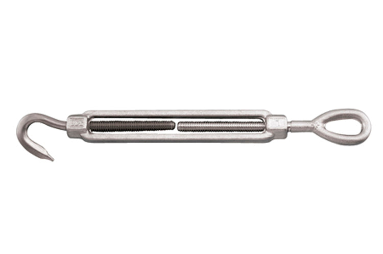 The Forged Hook and Eye Turnbuckle features an open body. These turnbuckles are available in sizes ranging from 1/4 to 3/4 to fit every project and are made from grade 316 stainless steel for maximum corrosion resistance and durability. They are ideal for marine and industrial applications. They meet the WLL and dimensions of ASTM specification F1145-05 (2011) Type 1, Class F.