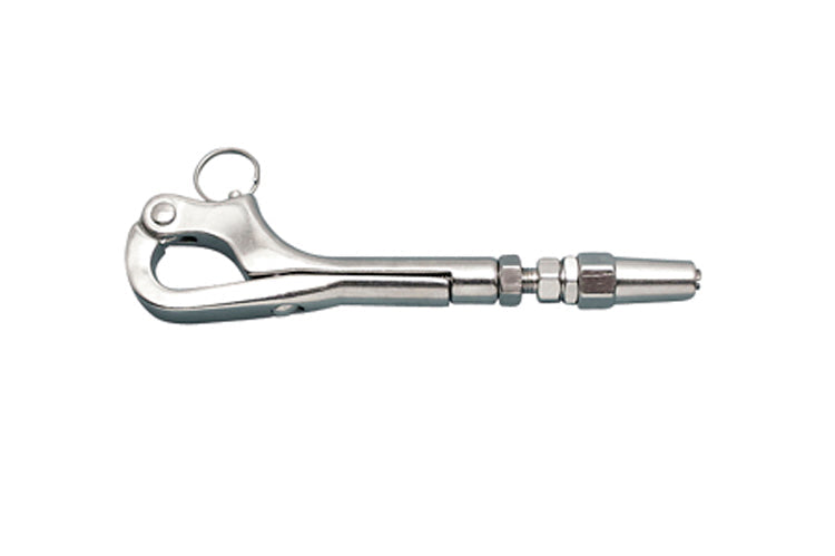 Rig a lifeline with a gate in minutes using the stainless steel Quick AttachTM Pelican Hook. It features a mechanical swage fitting which allows for fast installation using simple hand tools. This swageless pelican hook can be used with any type of cable construction (119, 719 or 77). NOT FOR USE ON STANDING RIGGING ON BOATS.