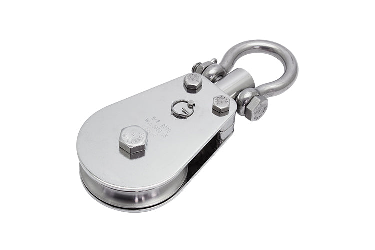 The PULLPRO SA Bow Shackle Block Rope is comprised of only the highest quality raw materials and features a grade 316 stainless steel forged SA Bow Shackle for strength and fatigue resistance and can be configured in a variety of ways within the 316 stainless steel cast head. Polished 316 stainless steel cheeks add durability to the block and ensure that it will hold up under harsh conditions in challenging environments. The polished cheeks feature the fibrous rope size, working load limit and Suncor logo permanently stamped into the side. A stainless steel locknut allows for sheave removal for premade fibrous rope installation and sheave serviceability and maintenance. The PULLPRO sheave is constructed from 316 stainless steel for maximum corrosion resistance and durability. Meets B30.26 specifications.