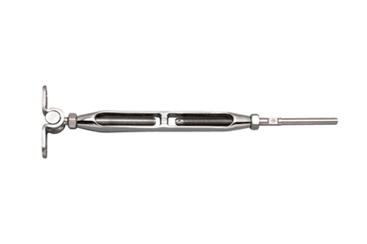 The Wall Mount and Hand Swage Stud Turnbuckle fits cable sizes 1/8 and 3/16. This hand swage turnbuckle features a hand swage stud, wall mount and an open style body. It is used in marine, industrial and architectural applications.