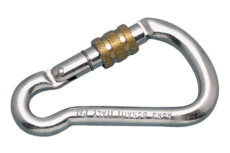 The Screw Lock Harness Clip is available in sizes ranging from 5/16 to 7/16 and is made from zinc-plated carbon steel. This clip features a brass screw lock. The break load is approximately three times the working load limit.